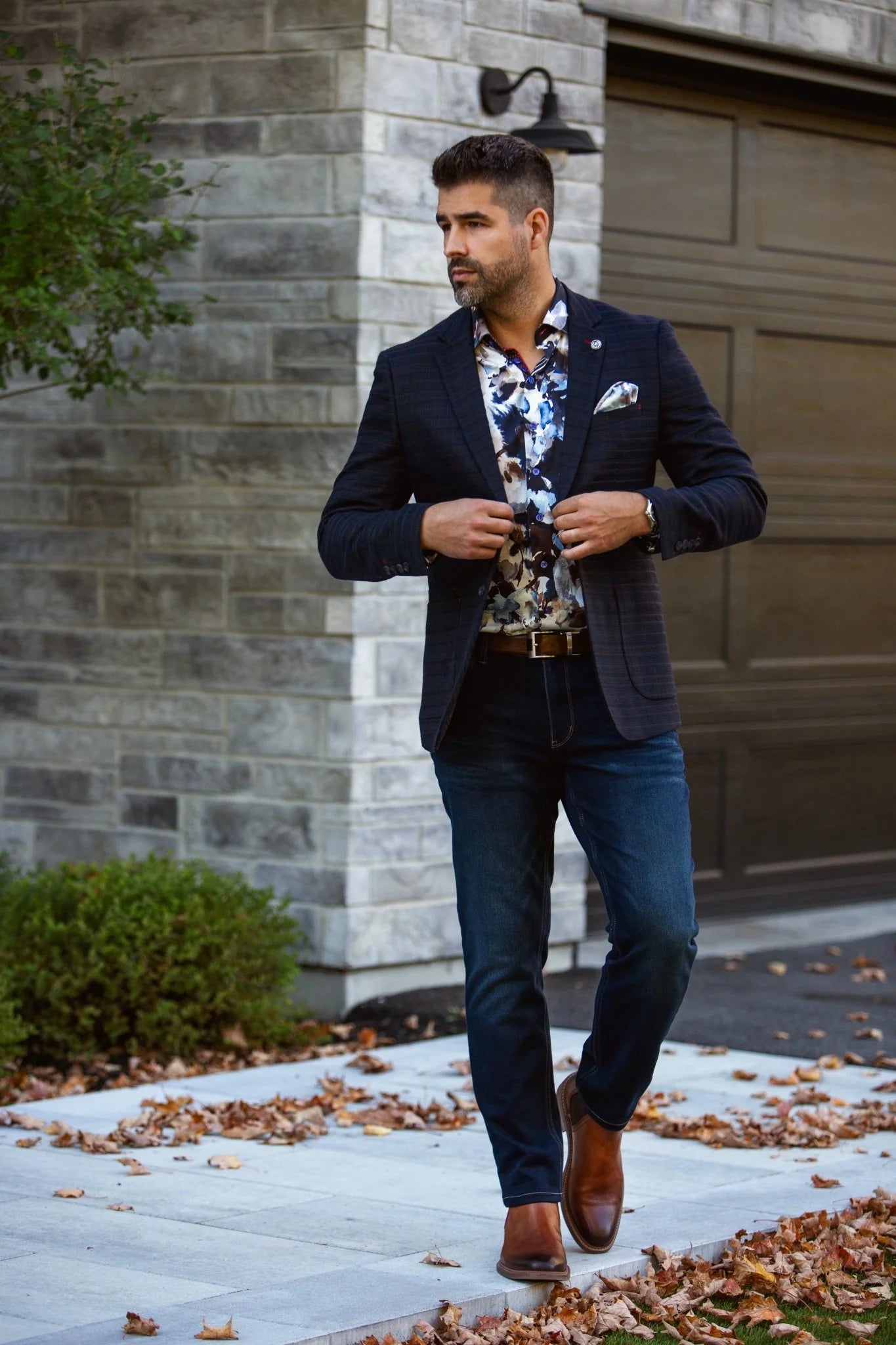 Blazer Fashionable and stretchy for men. Stand out with our sophisticated details and patterned lining. Comfortable with a premium fabric blend offering confidence and freedom of movement.