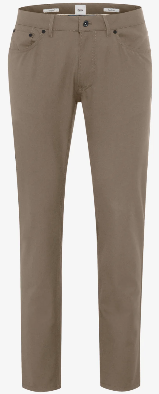 80-4400/ 54 CamelWith its clean lines and tapered leg, the chino in STYLE TINO embodies modern elegance with a timeless touch. The flat-finished pleats and the slightly tapered Tapered Fit give the silhouette structure and dynamism without losing its casual appeal. French slit pockets and piped back pockets emphasize the polished look and add subtle design accents. The classic button and zipper closure completes the overall design functionally. Behind the stylish appearance lies an innovative material composition: The exclusive Ceramica quality combines 39% virgin wool with synthetic high-tech fibers such as polyester, viscose, polyamide, and a hint of elastane. The result: A fabric that impresses with its high shape stability and wrinkle resistance while also offering breathability, elasticity, and ease of care. This chino is not only easy to iron and quick-drying but also provides exceptional comfort—perfect for demanding everyday moments and style-conscious business looks.