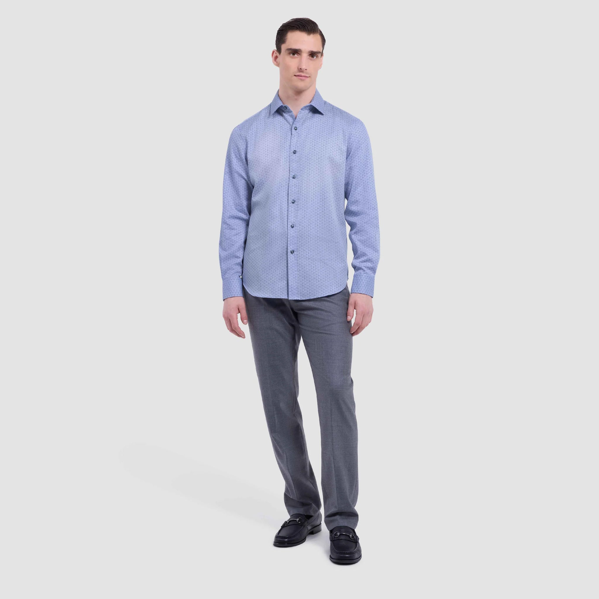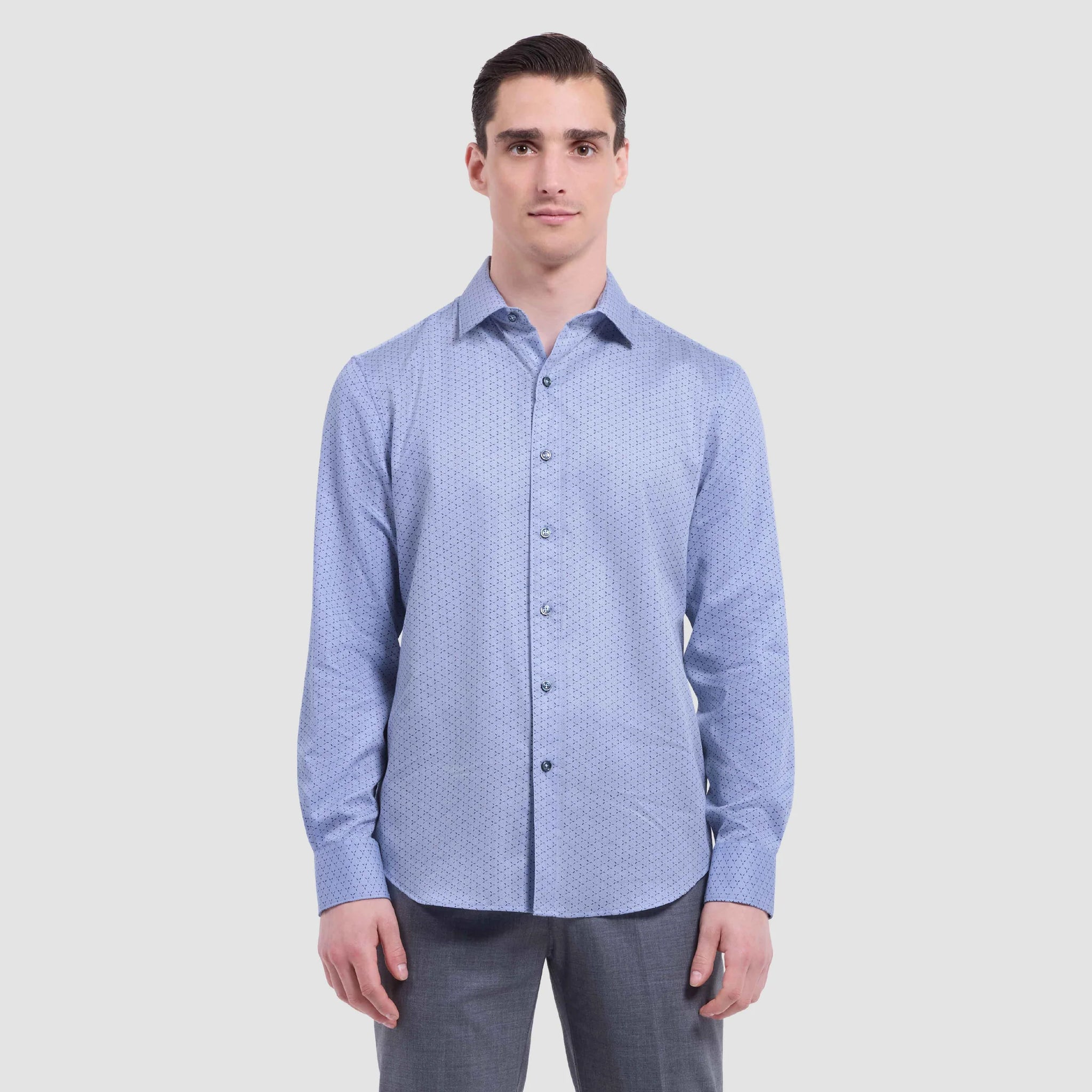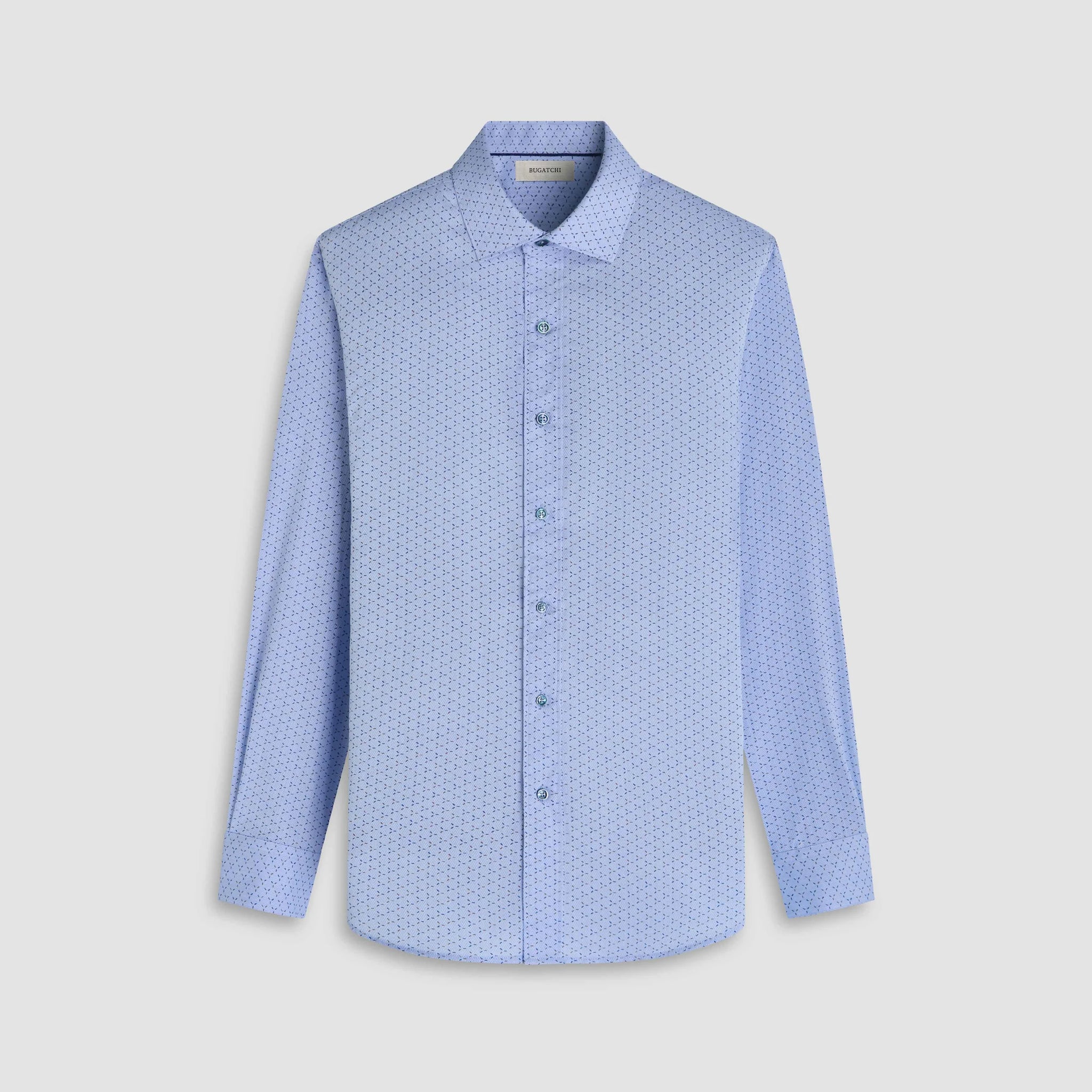 The Axel long-sleeve shirt in geometric print is crafted from premium 100% Italian cotton. It features a spread collar, mother-of-pearl buttons, a curved hem that looks great tucked or untucked, and adjustable notched cuffs that also convert for cufflinks. A refined, all-occasion shirt.
