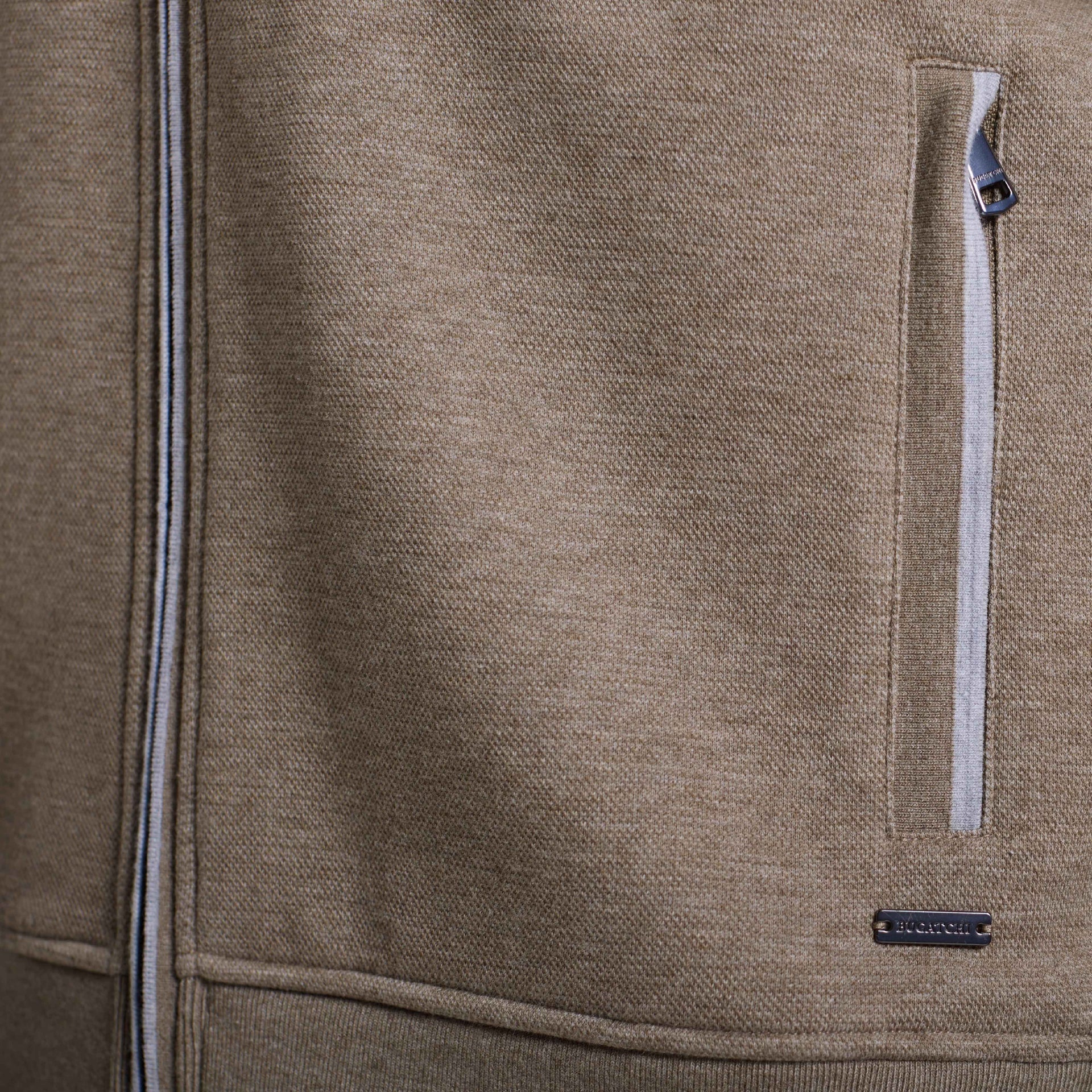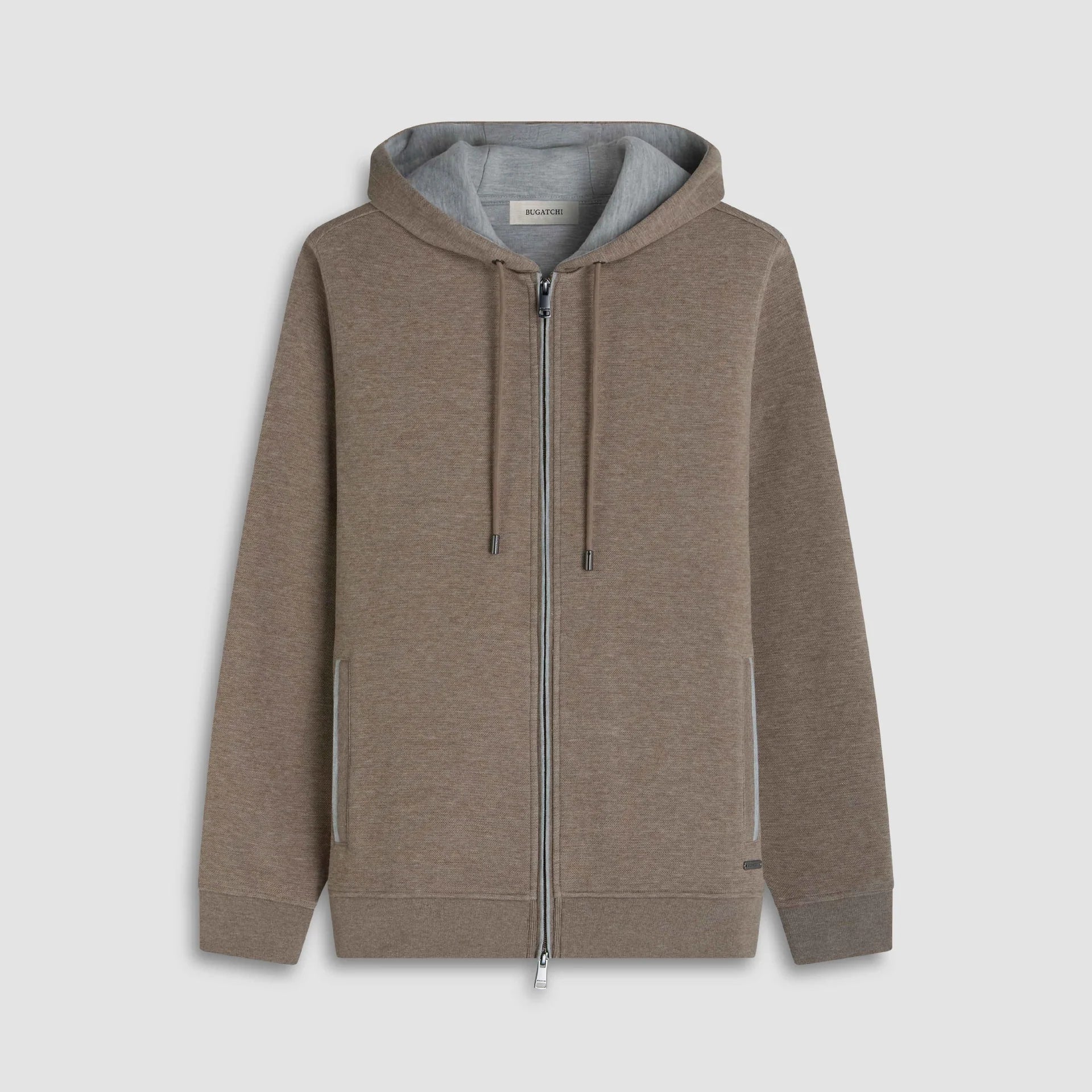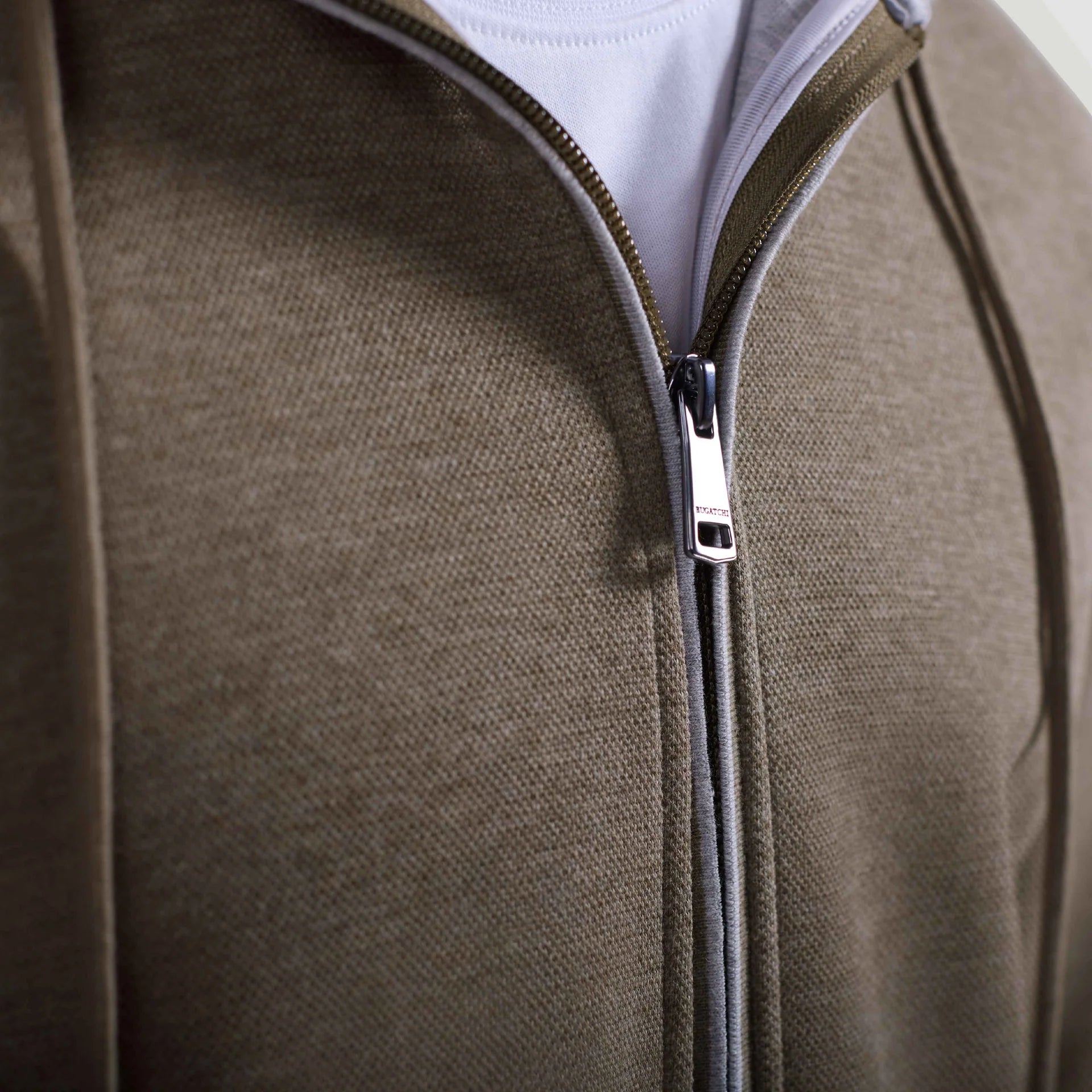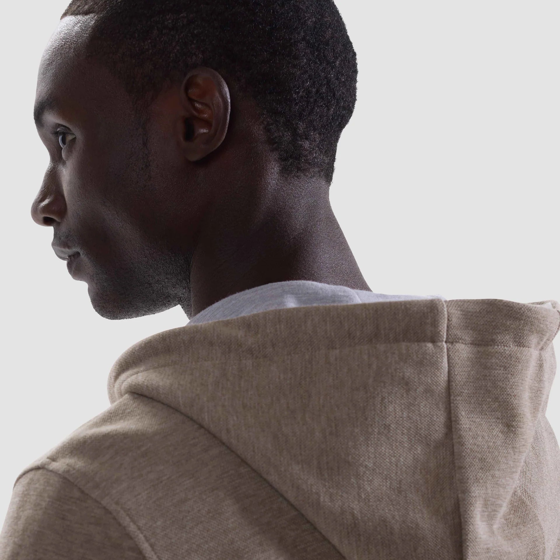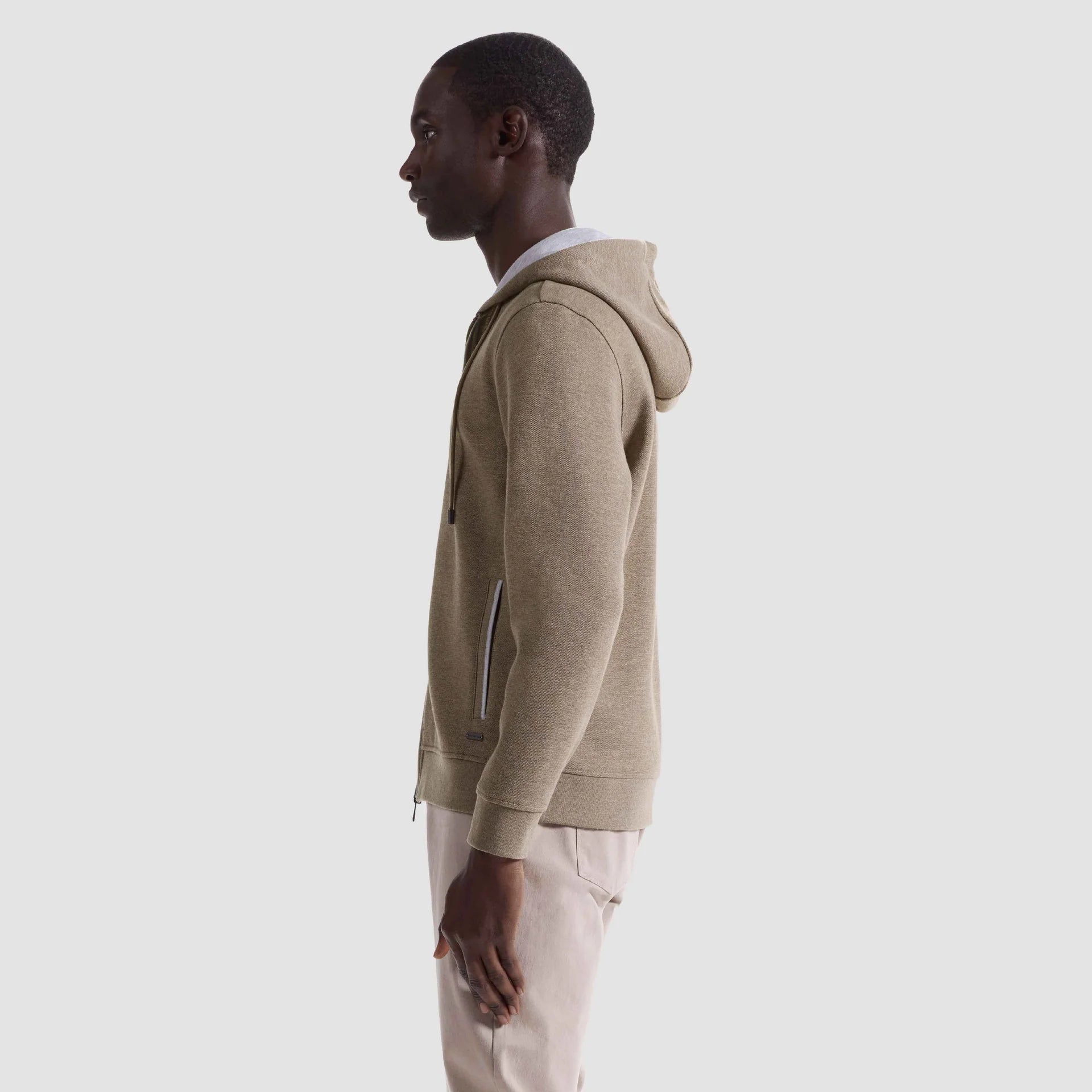 Crafted from a premium performance polyester-cotton blend, this hoodie features a heathered pique exterior with a soft heathered jersey interior for a comfortable, double-faced finish. Designed with a drawstring hood, two-way zipper closure, and two zippered side pockets with covered plackets. Contrast tipping detail on the zipper placket and pocket plackets adds a refined touch.