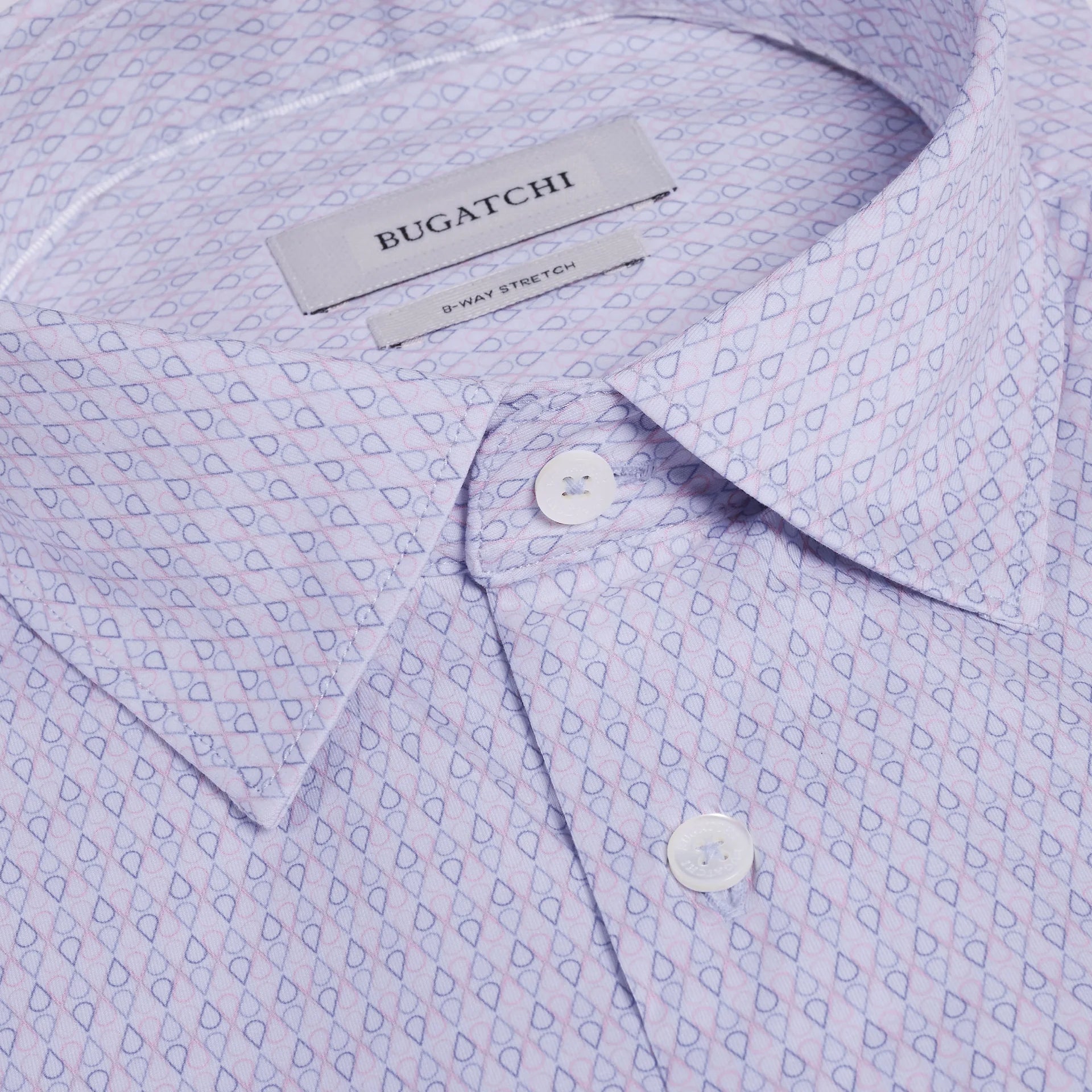 The James OoohCotton® long-sleeve shirt elevates everyday style with a geometric loop print, point collar, genuine mother-of-pearl buttons, and a curved hem for a polished tucked or untucked look. Adjustable notched cuffs offer a customizable fit and convert to accommodate cufflinks. Made from our signature OoohCotton® double-mercerized performance fabric with 8-way stretch, moisture-wicking, quick-dry, wrinkle-resistant, and thermal comfort properties.