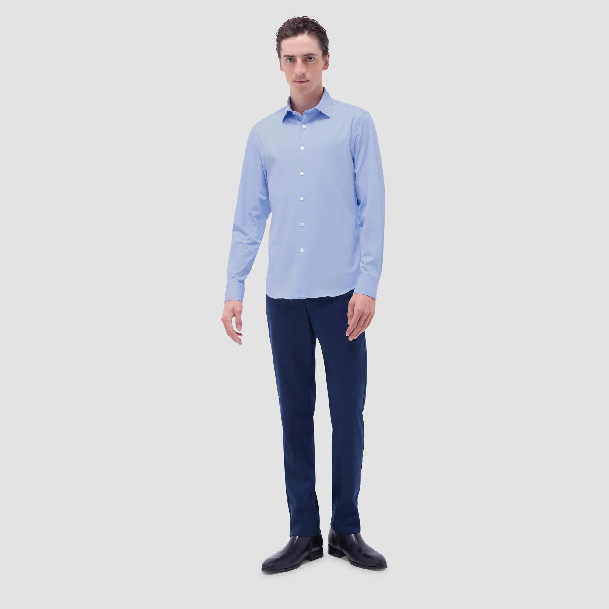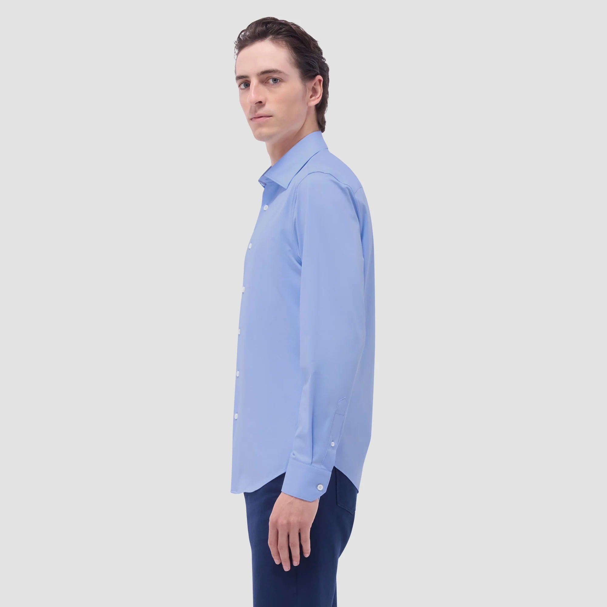 The James solid OoohCotton® shirt features a point collar, adjustable and convertible notched cuffs, mother-of-pearl buttons, and a curved hem perfect for wearing tucked or untucked. OoohCotton® is a performance, double-mercerized, wrinkle-resistant, breathable, and easy-care cotton blend with 8-way stretch, quick-dry, and thermal comfort properties.