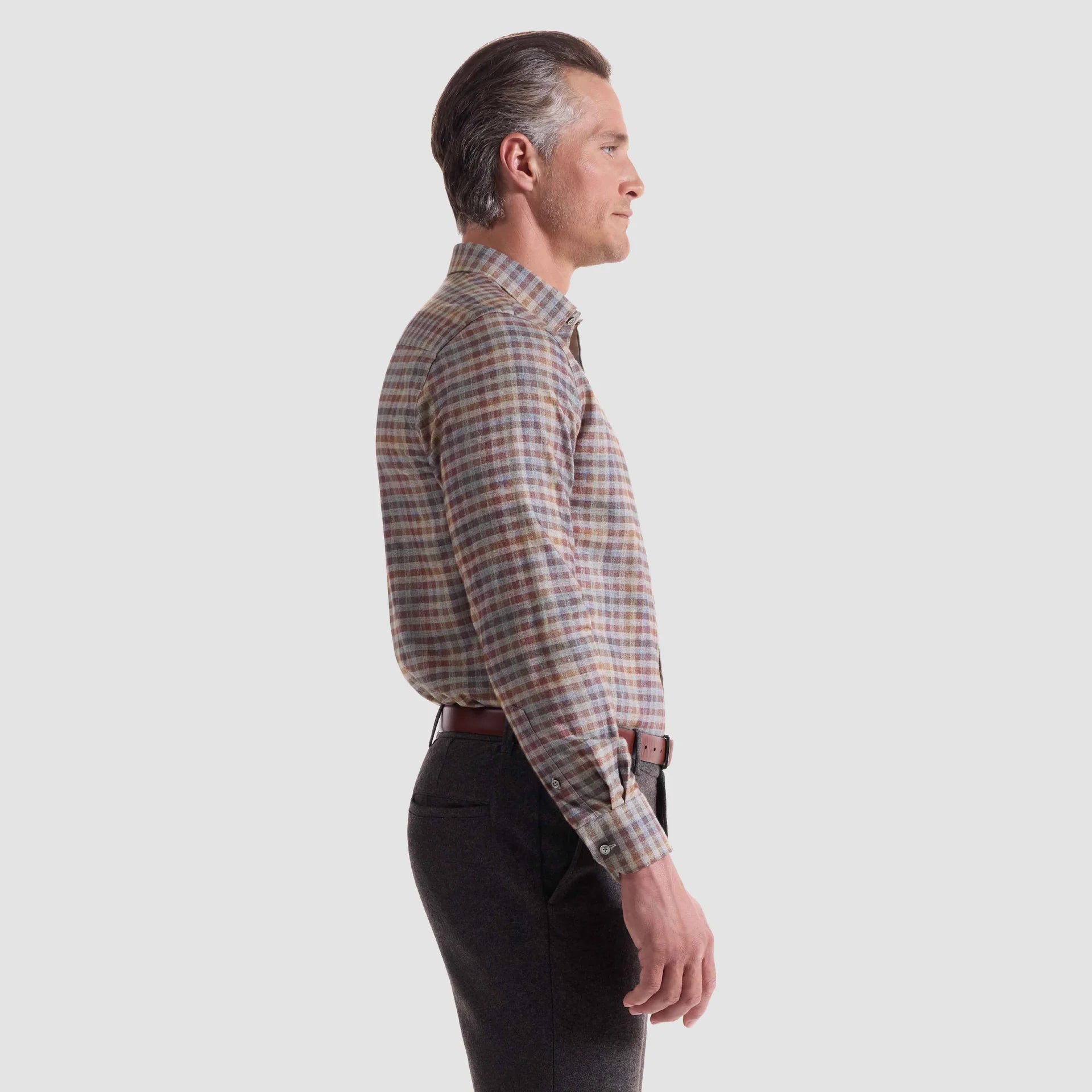 The Julian long-sleeve shirt in brushed plaid is crafted from premium 100% cotton. It features a point collar, mother-of-pearl buttons, a curved hem that looks great tucked or untucked, and adjustable notched cuffs that also convert for cufflinks. A refined, all-occasion shirt.