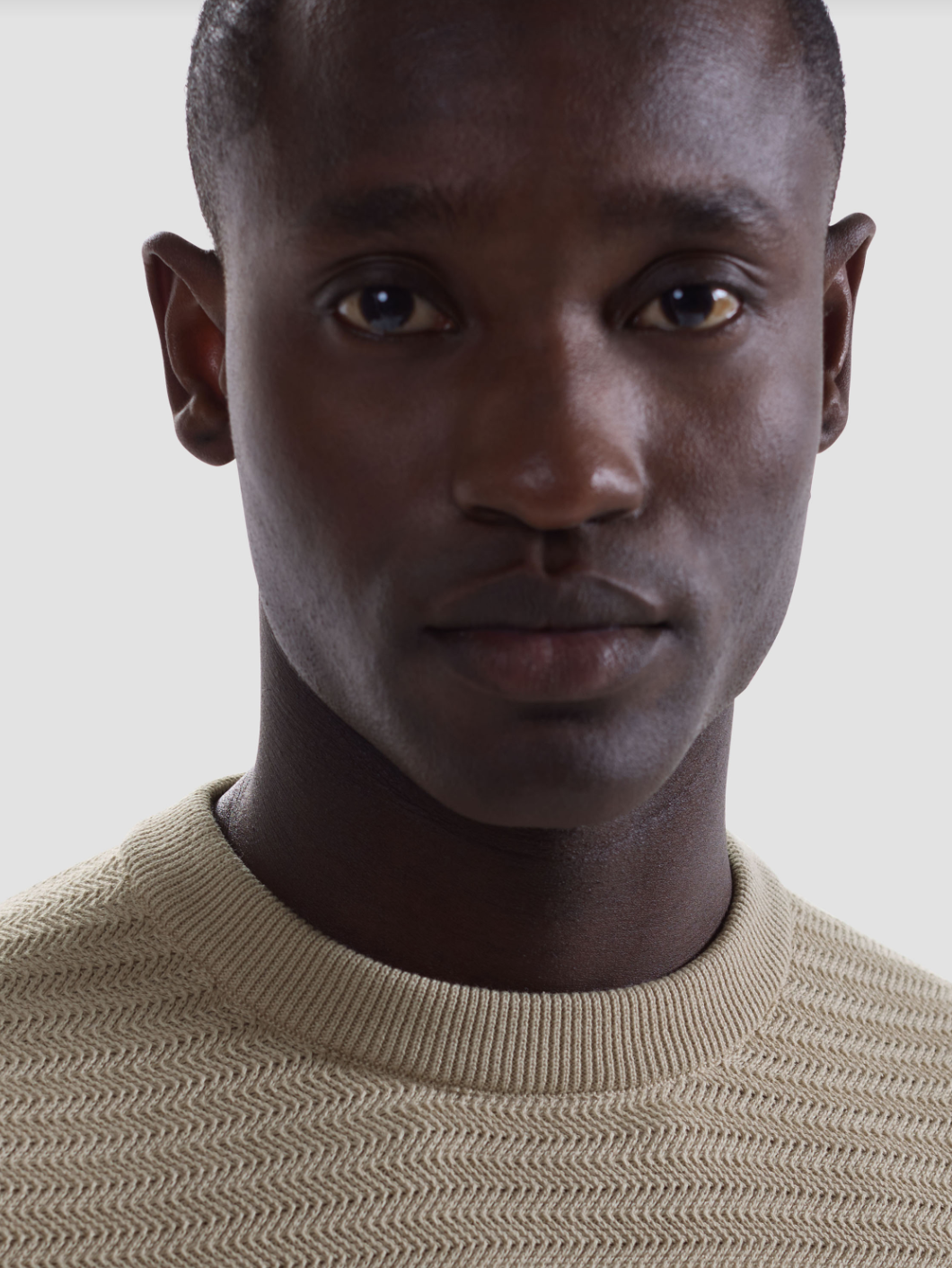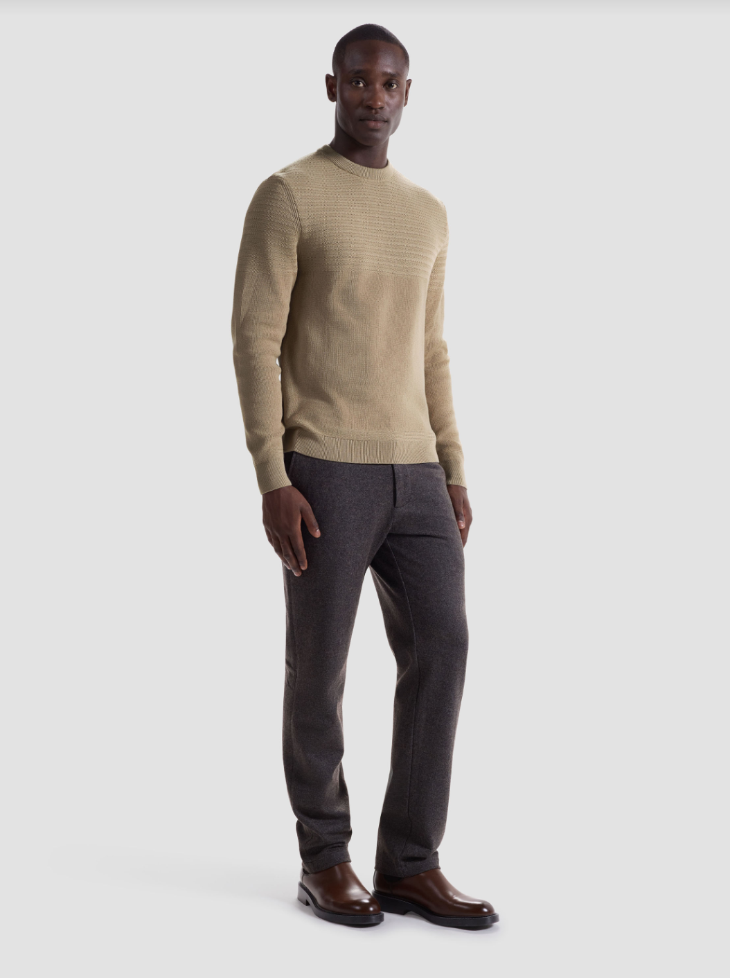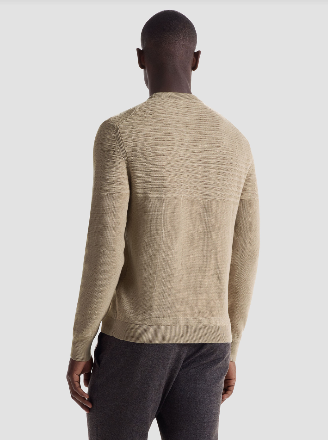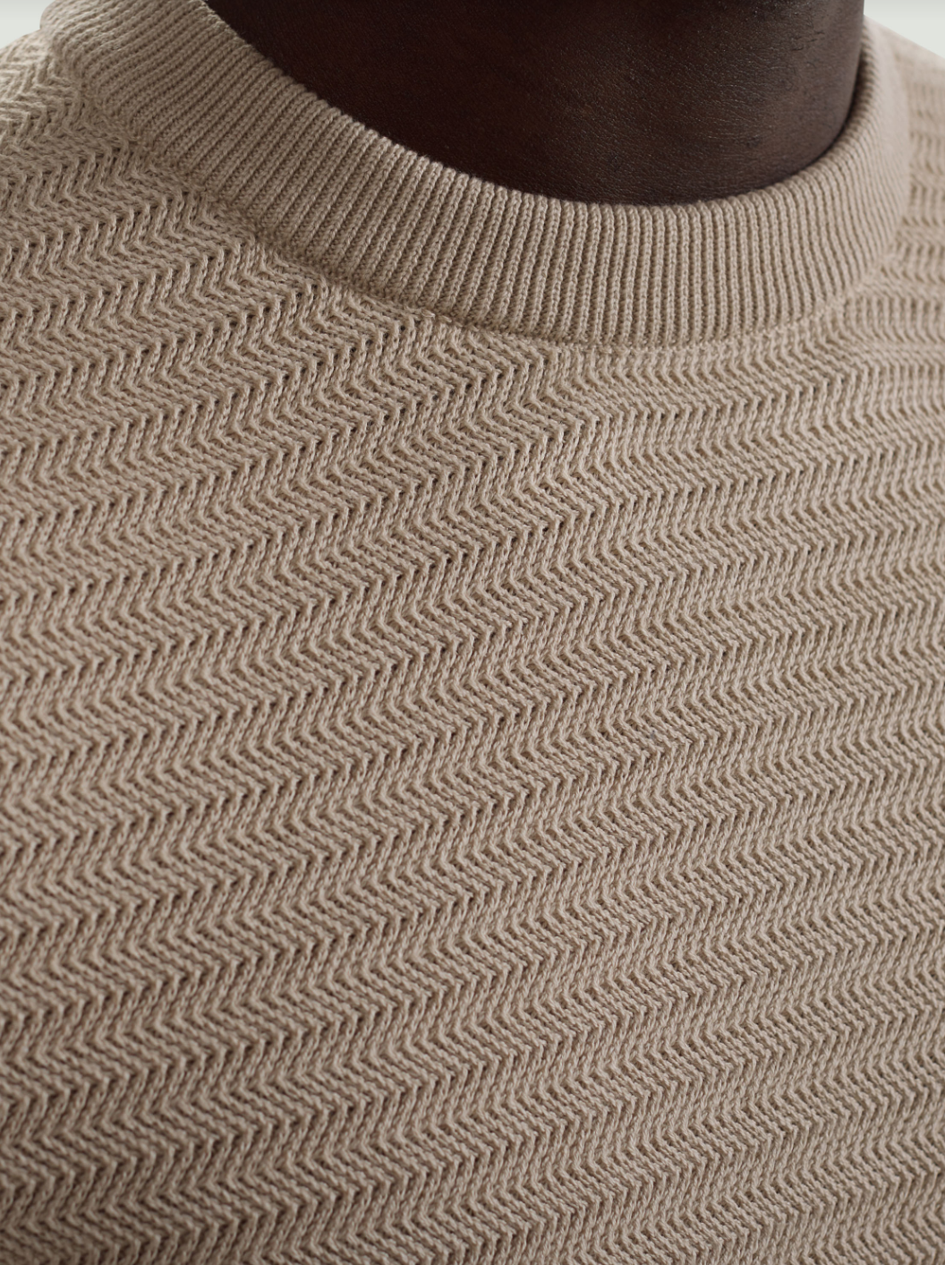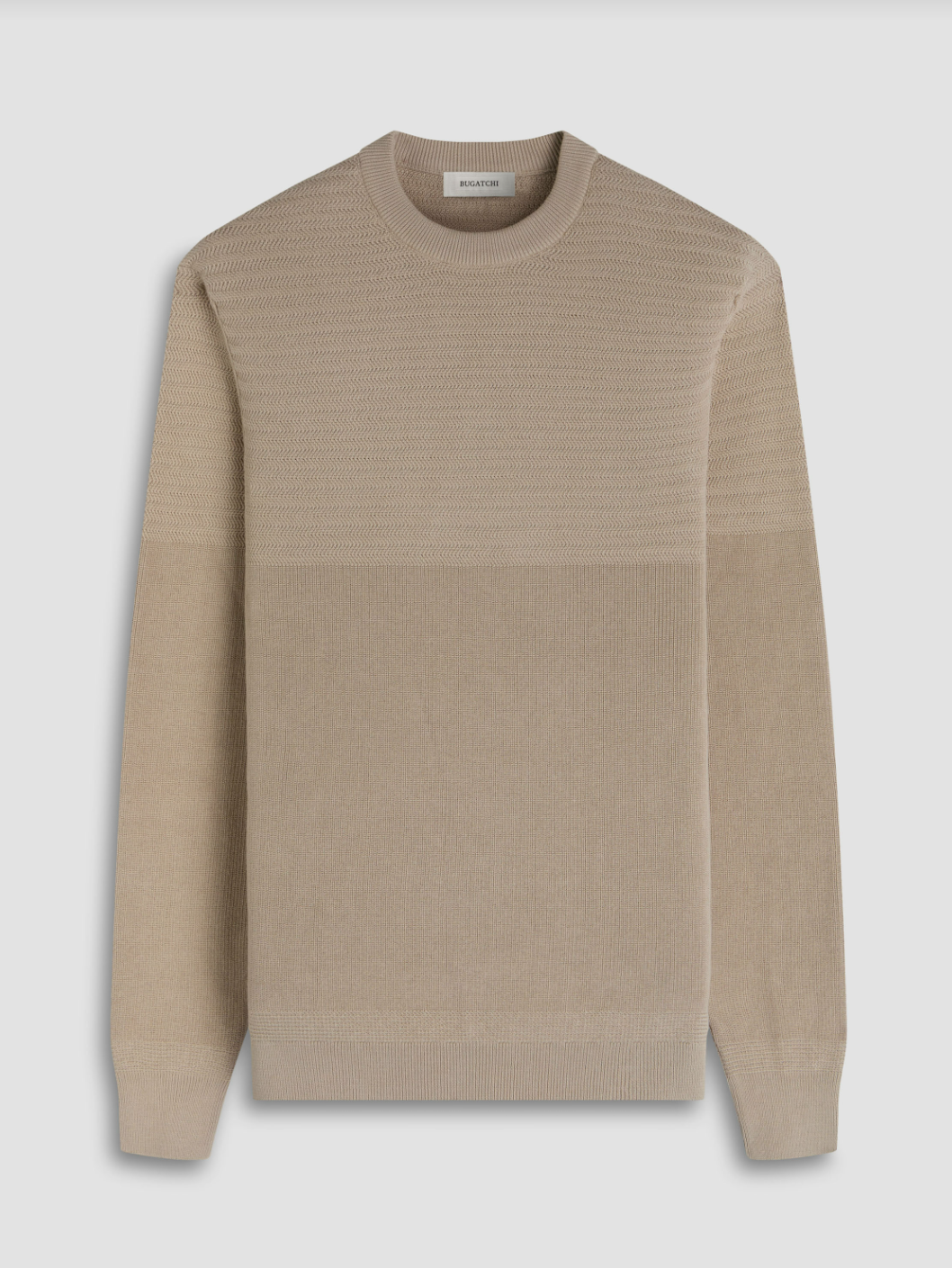 Crafted from 100% cotton, this crewneck sweater features a combination of herringbone and garter stitch for a refined, textured look. The ribbed neckline, cuffs, and hem are accented with subtle herringbone stitch detailing, adding a polished finish. A versatile piece that blends modern structure with classic knit techniques.