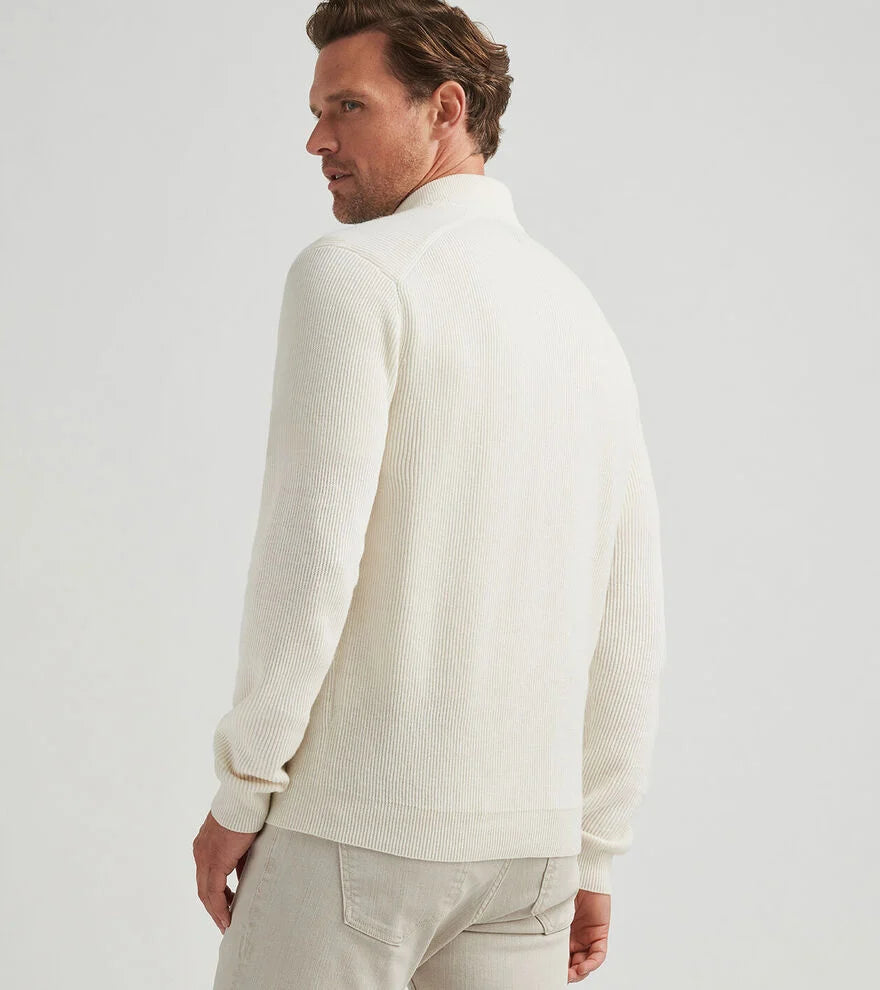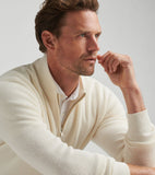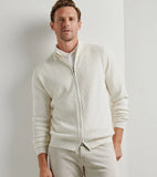 With an English rib knit from an intricate cotton/wool/linen/silk/cashmere blend, this two-way zip sweater stands out for elegant simplicity and singular softness. Features a sueded accent at the interior collar and finely crafted, fully fashioned sleeves.